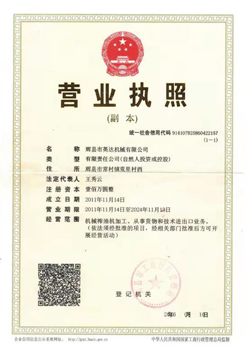 輝縣市英達機械有限公司成立于1983年,是在原輝縣市榨油機配件廠的基礎上改制而成?,F建筑面積面積7000平方米,員工120人。公司距省會鄭州僅90公里,毗鄰京珠高速、107國道等交通要線,交通十分便利。 公司從榨油機配件起家,經過30余年的艱苦創業,業務范圍逐漸從各類大中小型糧油單機擴展至植物油、動物油、糧食加工全套生產線,客戶群體涵蓋小型家庭用戶和大型糧油公司投資項目。英達機械已升級蛻變成為集研發、生產、銷售為一體的糧油機械生產廠家。 英達機械根據客戶需求,為客戶提供更實用、靈活的配置方案,產品在國內占據穩定市場,更遠銷東南亞、中亞、非洲等世界各國,深受消費者喜愛和信賴。 企業精神:誠實守信、創新進取;科學發展,造福社會。 企業標準:制度規范化,管理化。 企業原則:實事求是,盡心盡力,共同發展。